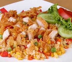 Masukkan daging dan udang, aduk sebentar. Masukkan nasi, aduk terus hingga rata betul di atas api kecil, angkat. Sajikan dengan taburan bawang goreng, telur dadar, irisan mentimun, dan kerupuk udang.
